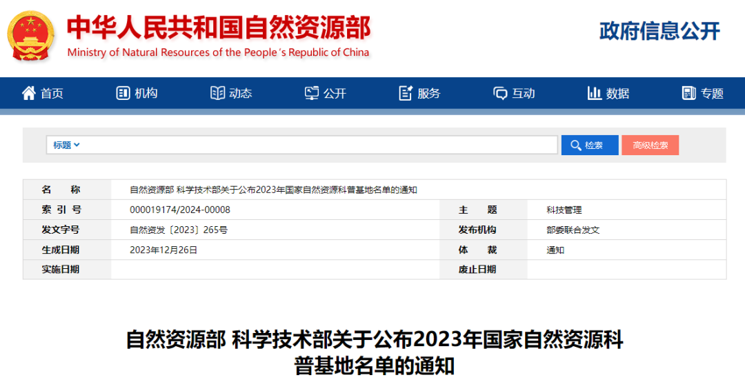 根据《自然资源部办公厅 科技部办公厅关于组织开展2023年度国家自然资源科普基地推荐工作的通知》(自然资办函〔2023〕816号)要求,自然资源部、科技部组织开展了国家自然资源科普基地专家评审工作,评审结果已公示无异议。现将北京市地下水科普中心等50家国家自然资源科普基地名单予以公布(见附件)。