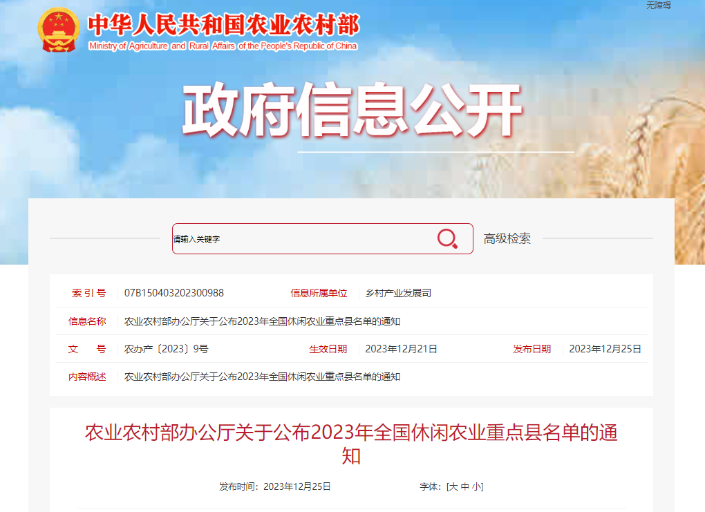 2023年全国休闲农业重点县名单