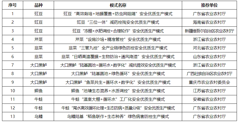 进一步满足人民群众对安全优质农产品的需求,推动传统种植养殖方式转型提升,农业农村部农产品质量安全监管司组织开展了安全优质生产模式征集。经各地推荐、专家评审、核实确认,形成了第一批安全优质生产模式,现予以推介,供各地根据实际参考借鉴。