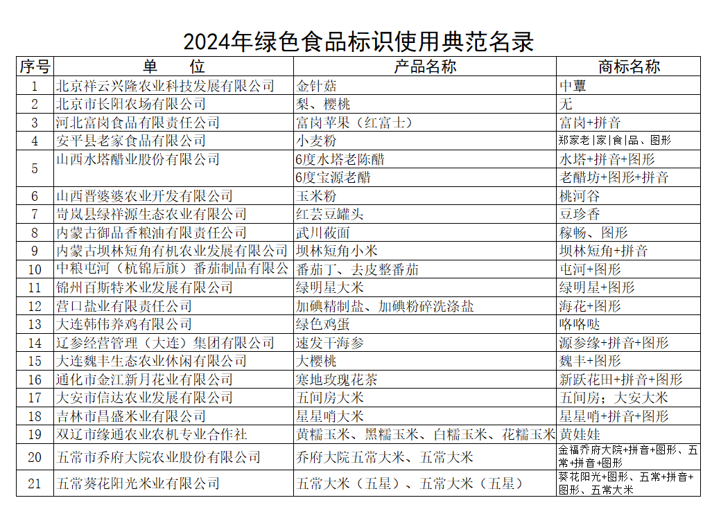 为推进绿色食品获证单位科学规范使用绿色食品标志,全方位提升绿色食品高品质绿色优质品牌形象,中国绿色食品中心组织开展了2024年度绿色食品标识使用典范遴选工作。经绿色食品获证单位自愿申请,省级绿色食品工作机构审核推荐,中心组织专家审评,确认北京祥云兴隆农业科技发展有限公司等140家绿色食品获证单位、200个绿色食品包装标识为2024年度全国绿色食品标识使用典范(见附件),并收录《绿色食品标识使用典范(2024)》,供全国绿色食品获证单位、绿色食品工作机构及相关方面采信参考。